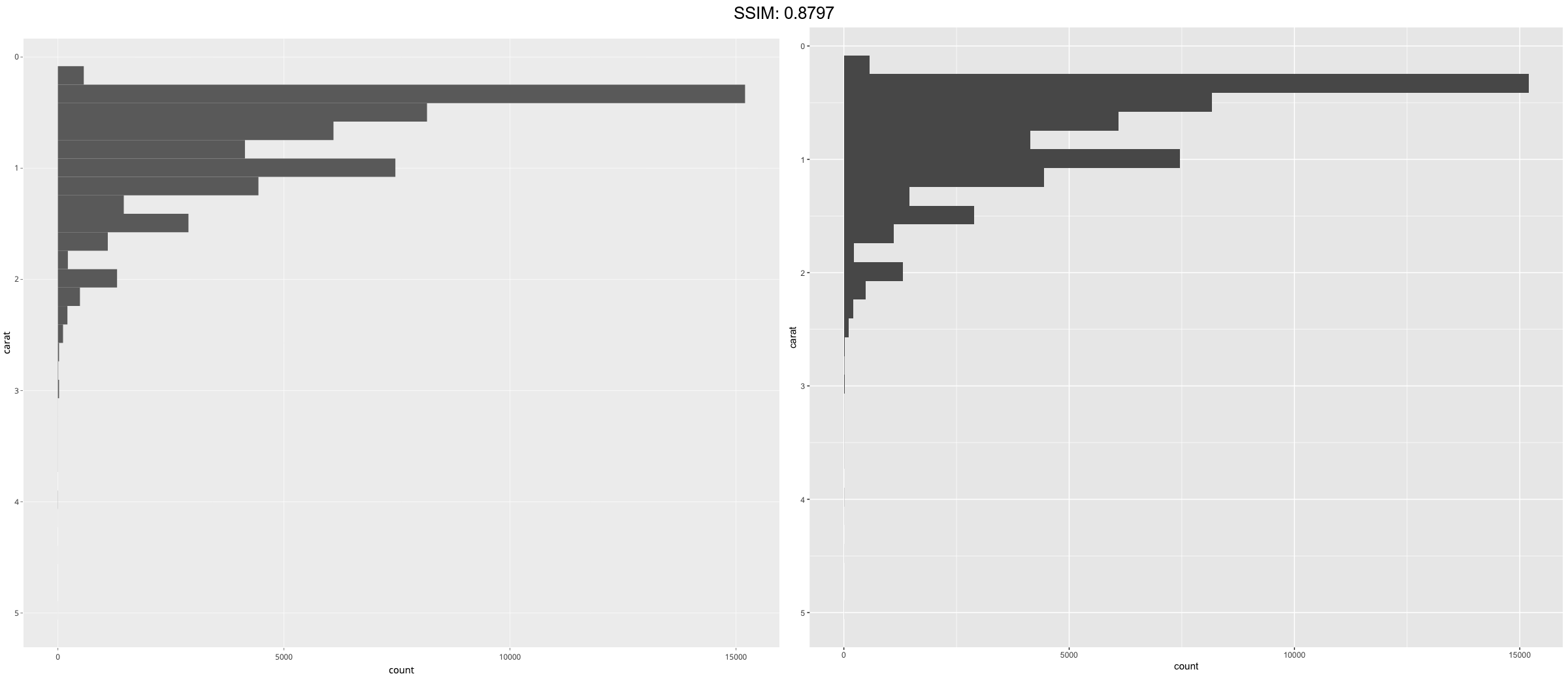 h <- ggplot(diamonds, aes(carat)) + geom_histogram() p <- h + coord_flip()