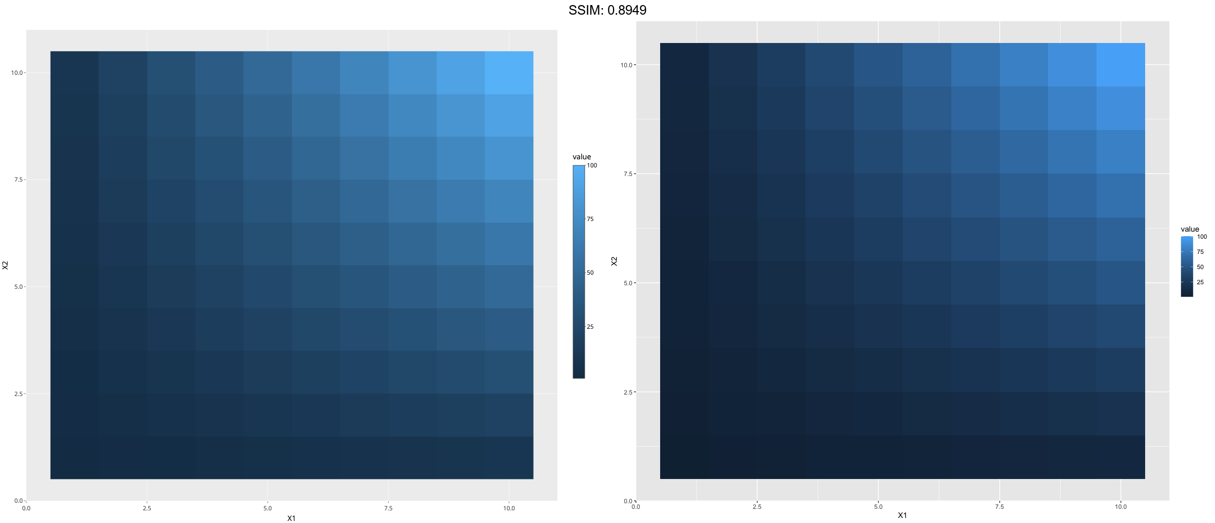 df <- expand.grid(X1 = 1:10, X2 = 1:10) df$value <- df$X1 * df$X2 p1 <- ggplot(df, aes(X1, X2)) + geom_tile(aes(fill = value)) p2 <- p1 + geom_point(aes(size = value)) p <- p1 + guides(fill = guide_colourbar(label.position = "left"))
