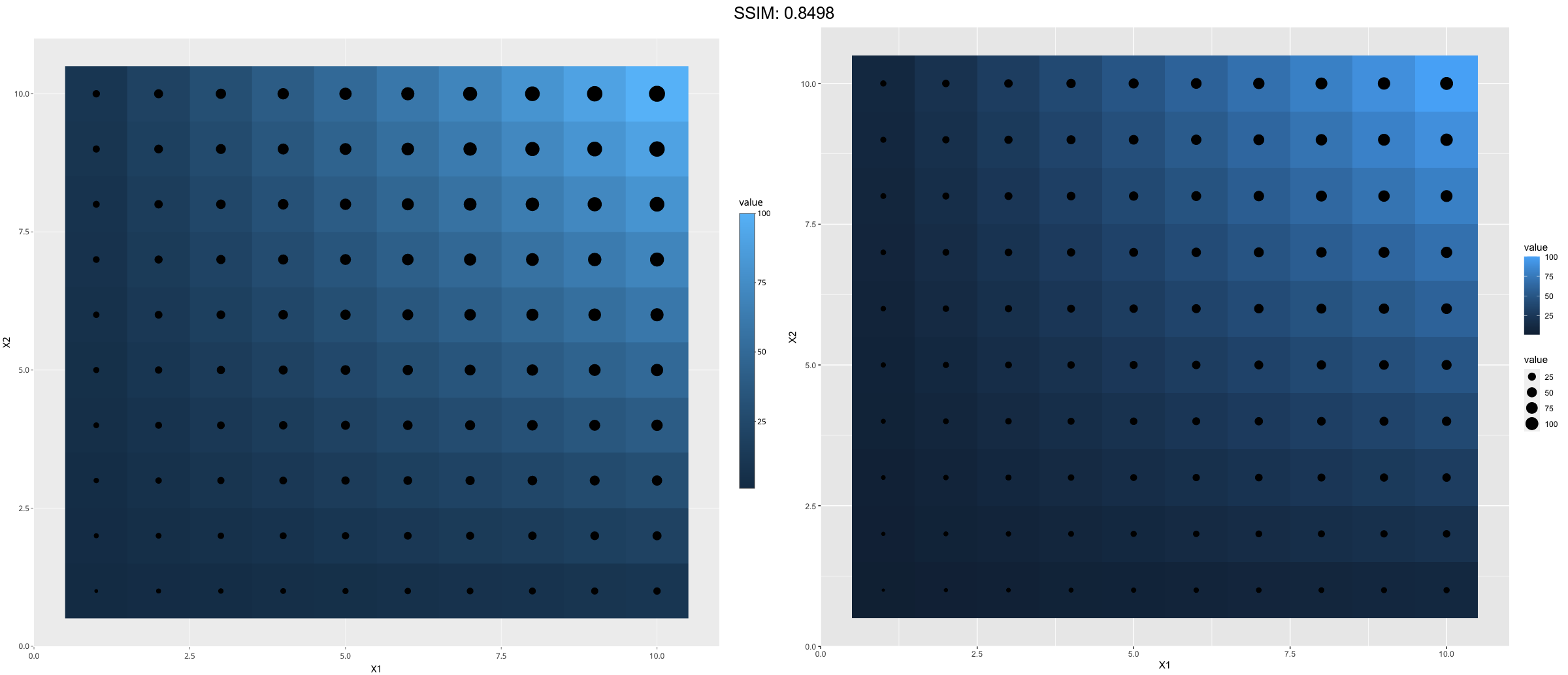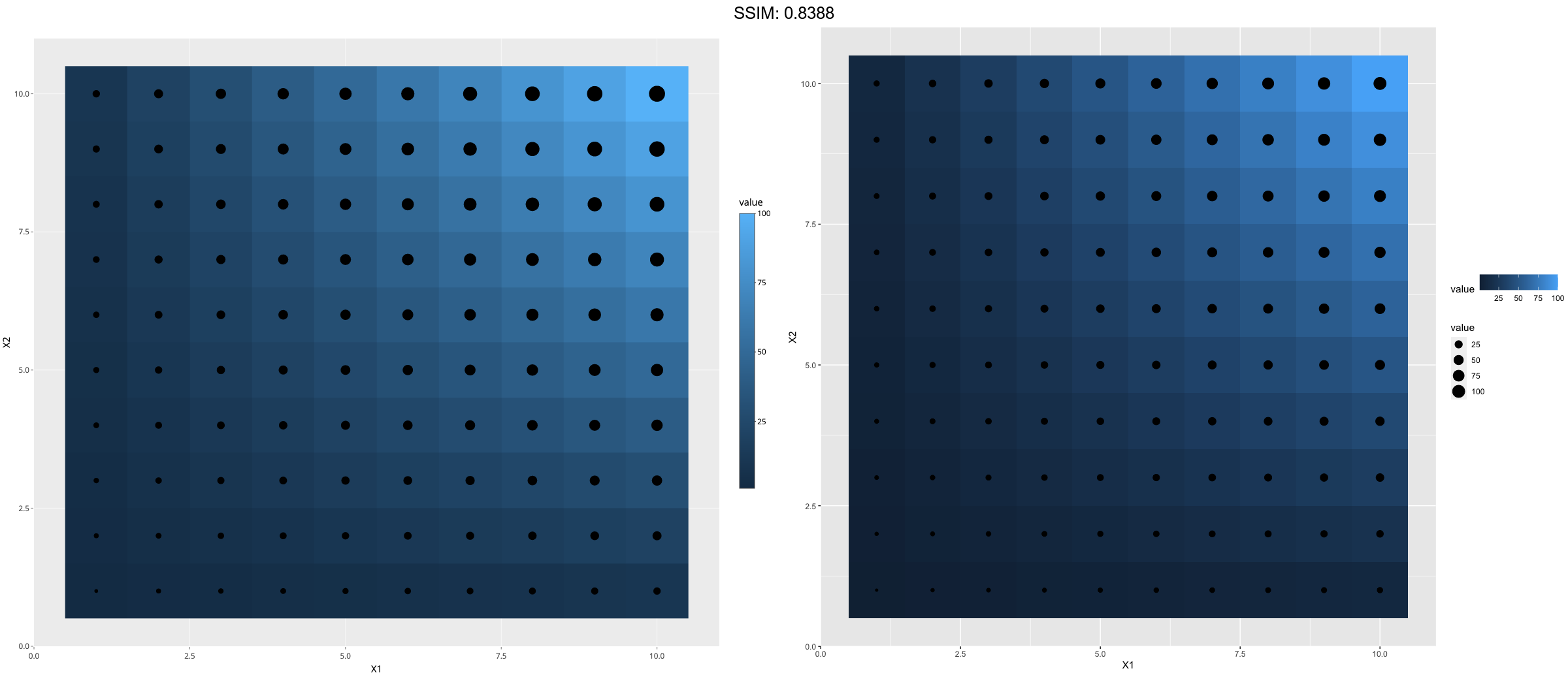df <- expand.grid(X1 = 1:10, X2 = 1:10) df$value <- df$X1 * df$X2 p1 <- ggplot(df, aes(X1, X2)) + geom_tile(aes(fill = value)) p2 <- p1 + geom_point(aes(size = value)) p <- p1 + scale_fill_continuous(guide = "colourbar")