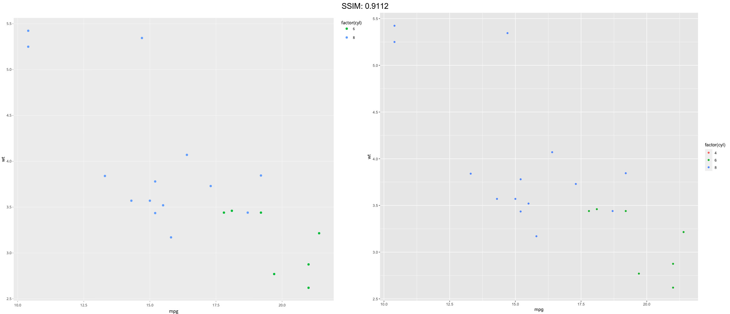 ggplot(big, aes(mpg, wt, colour = factor(cyl))) +