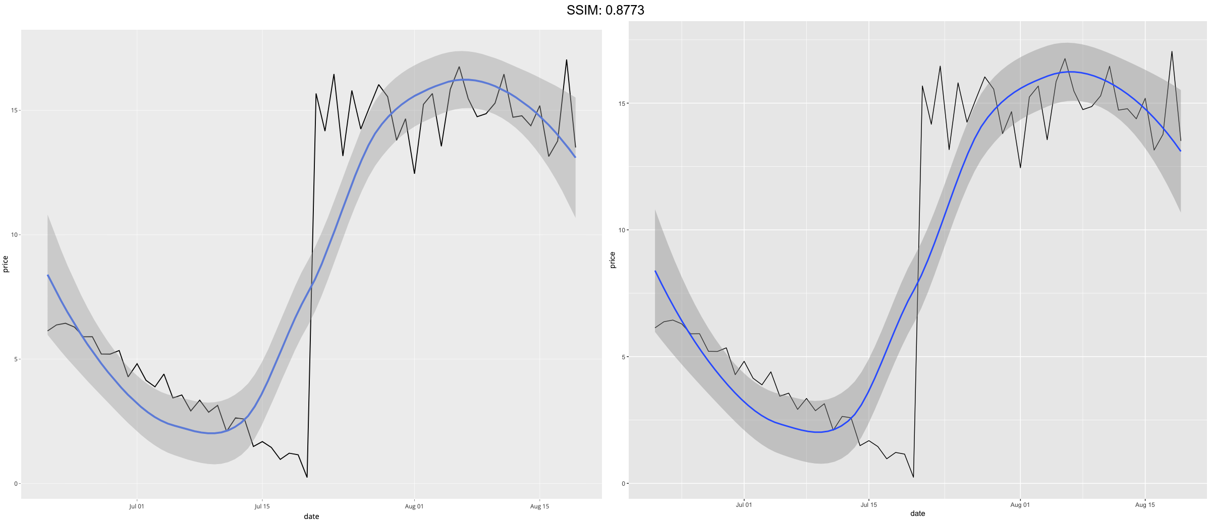 last_month <- Sys.Date() - 0:59 df <- data.frame( date = last_month, price = c(rnorm(30, mean = 15), runif(30) + 0.2 * (1:30)) ) p <- ggplot(df, aes(date, price)) + geom_line() + stat_smooth()