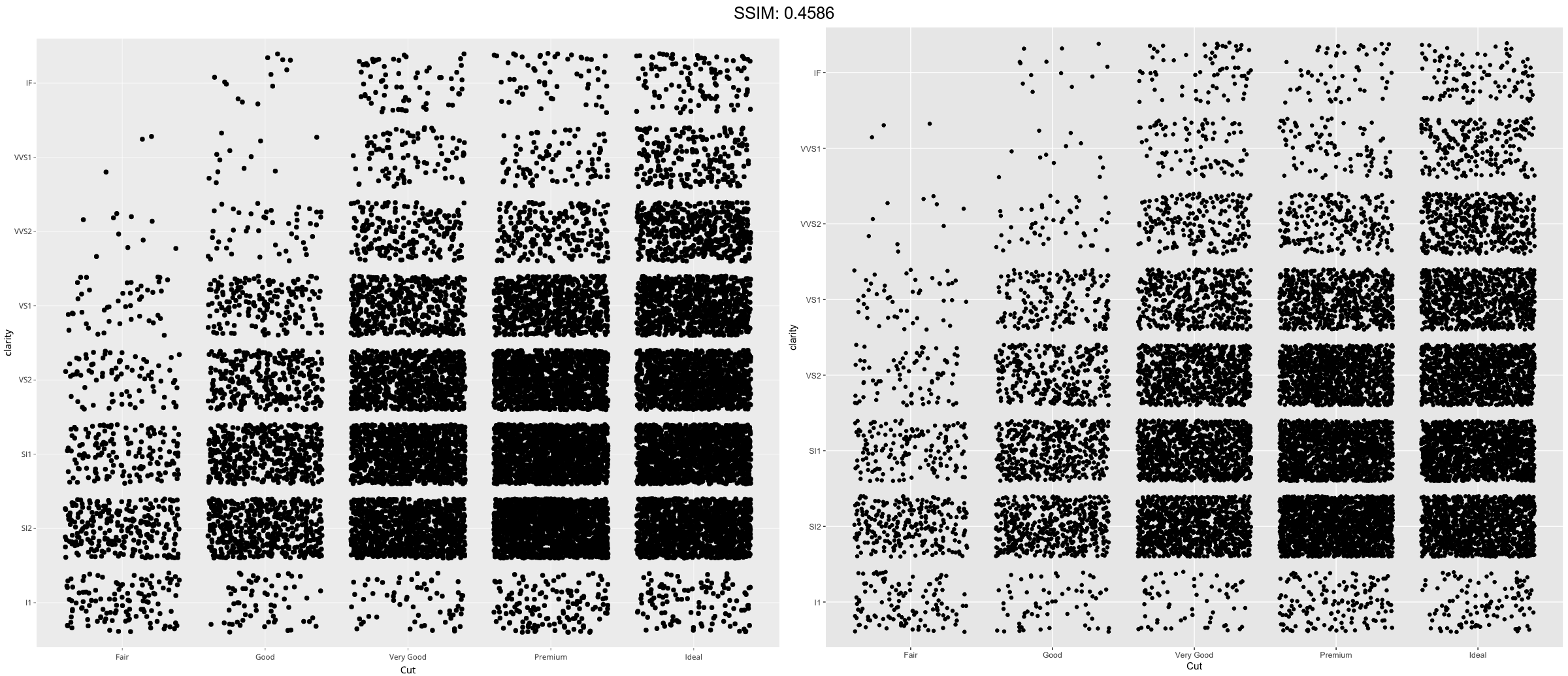 (d <- ggplot(subset(diamonds, carat > 1), aes(cut, clarity)) +