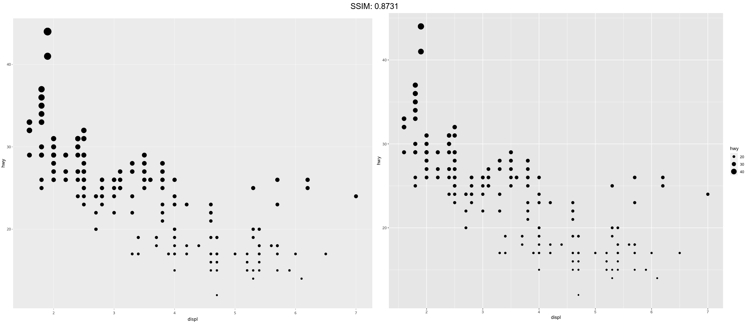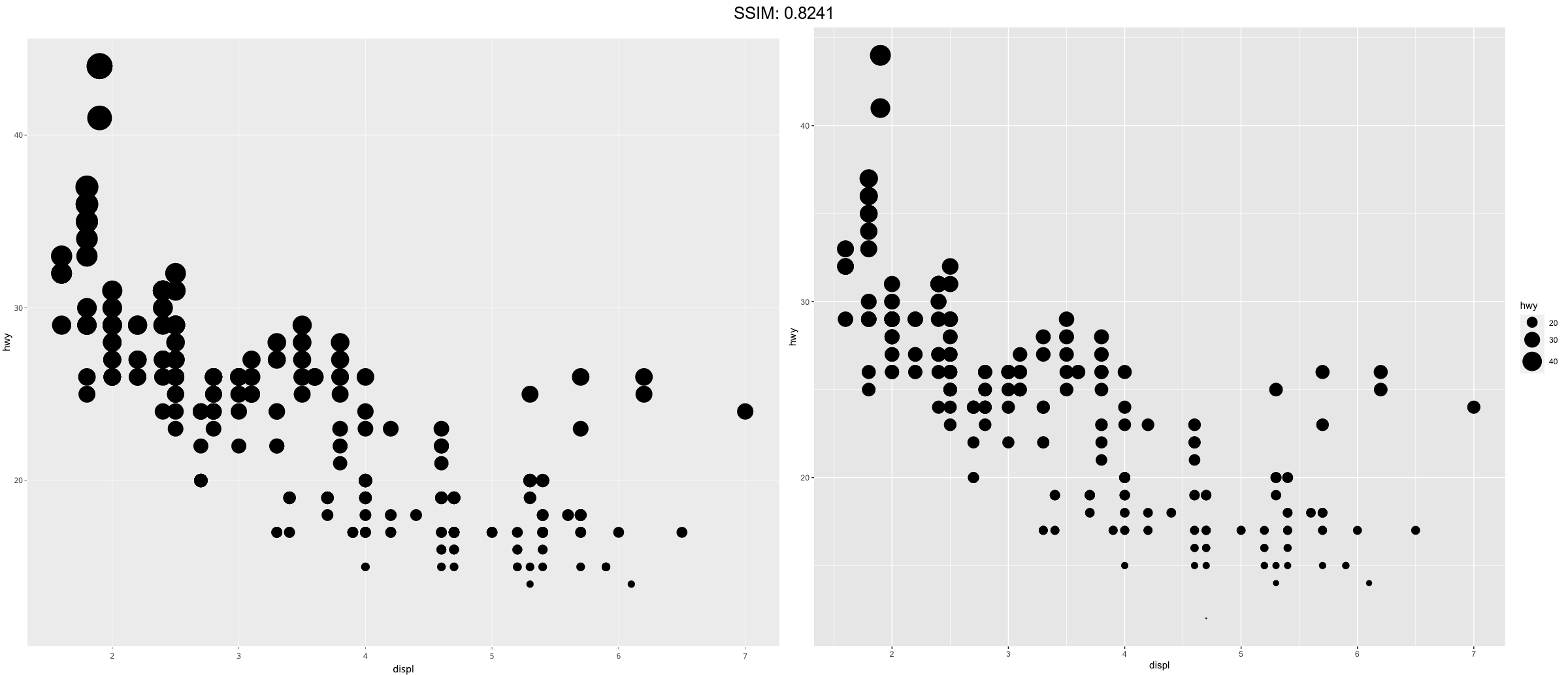 p <- ggplot(mpg, aes(displ, hwy, size = hwy)) + geom_point()