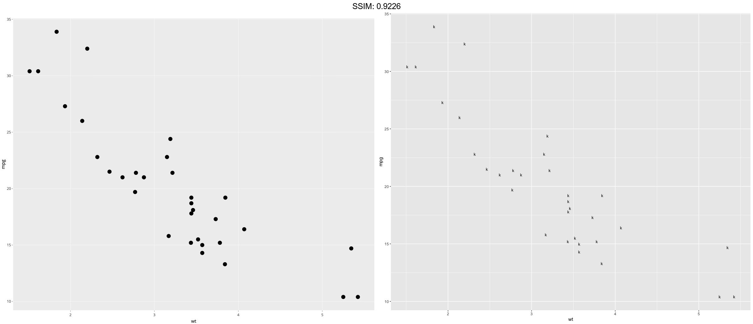 p <- ggplot(mtcars, aes(wt, mpg)) p <- p + geom_point(shape = "k", size = 3)