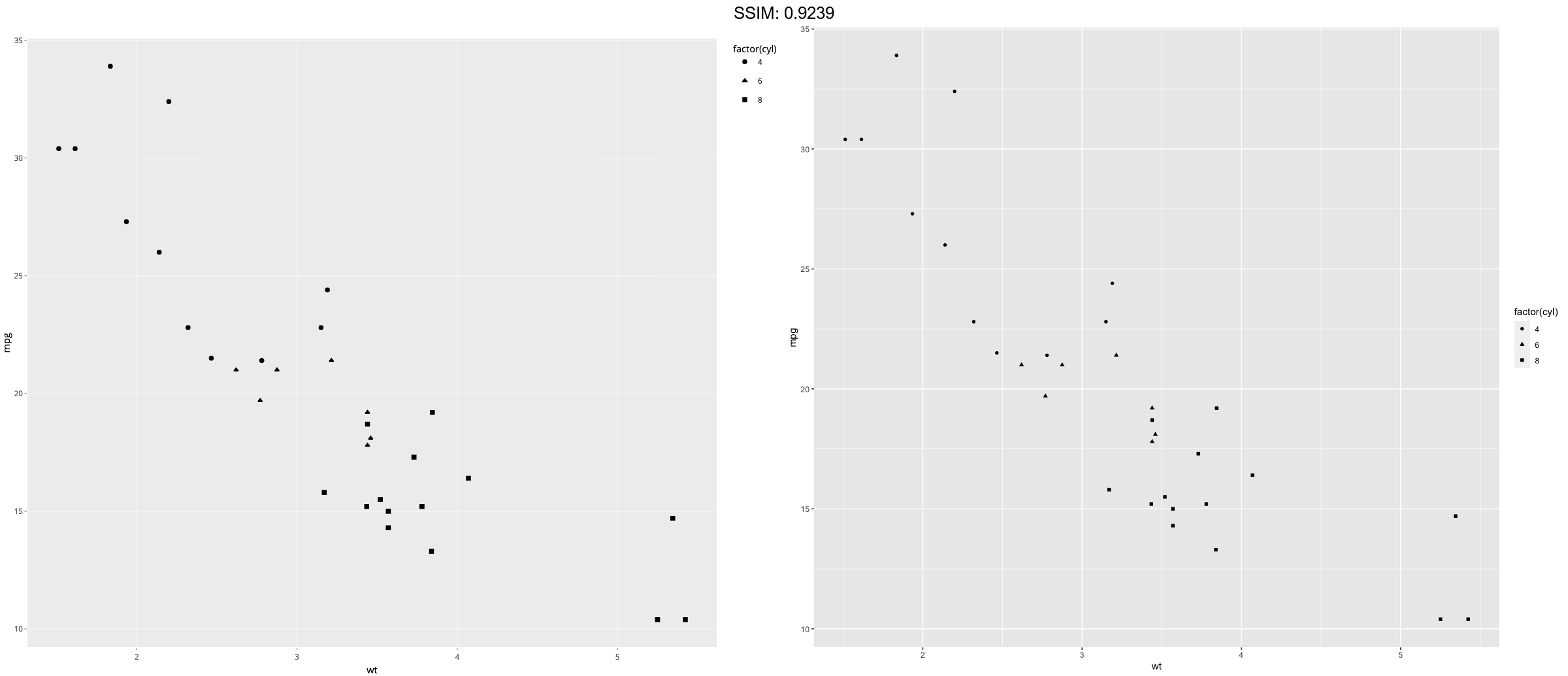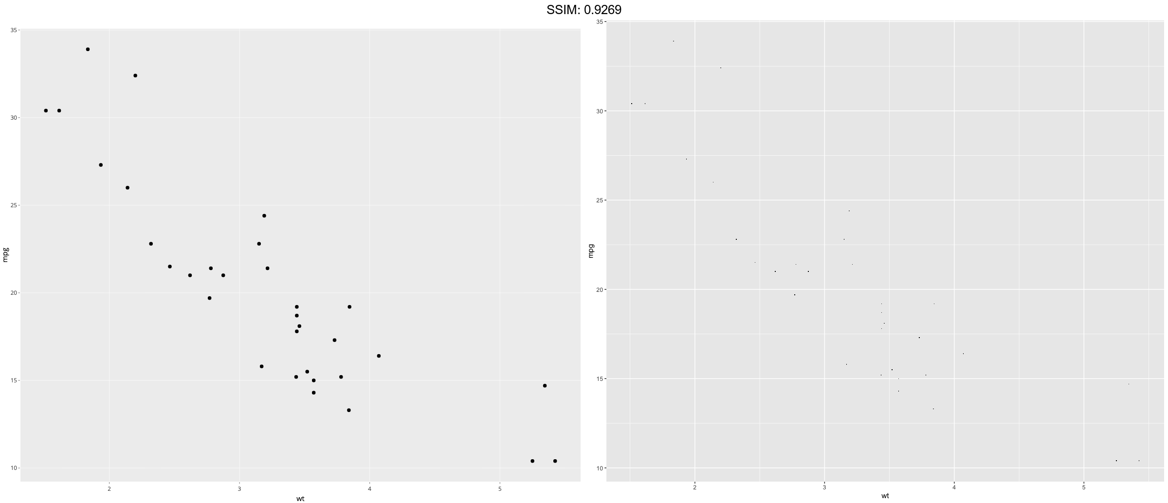 p <- ggplot(mtcars, aes(wt, mpg)) p <- p + geom_point(shape = ".")