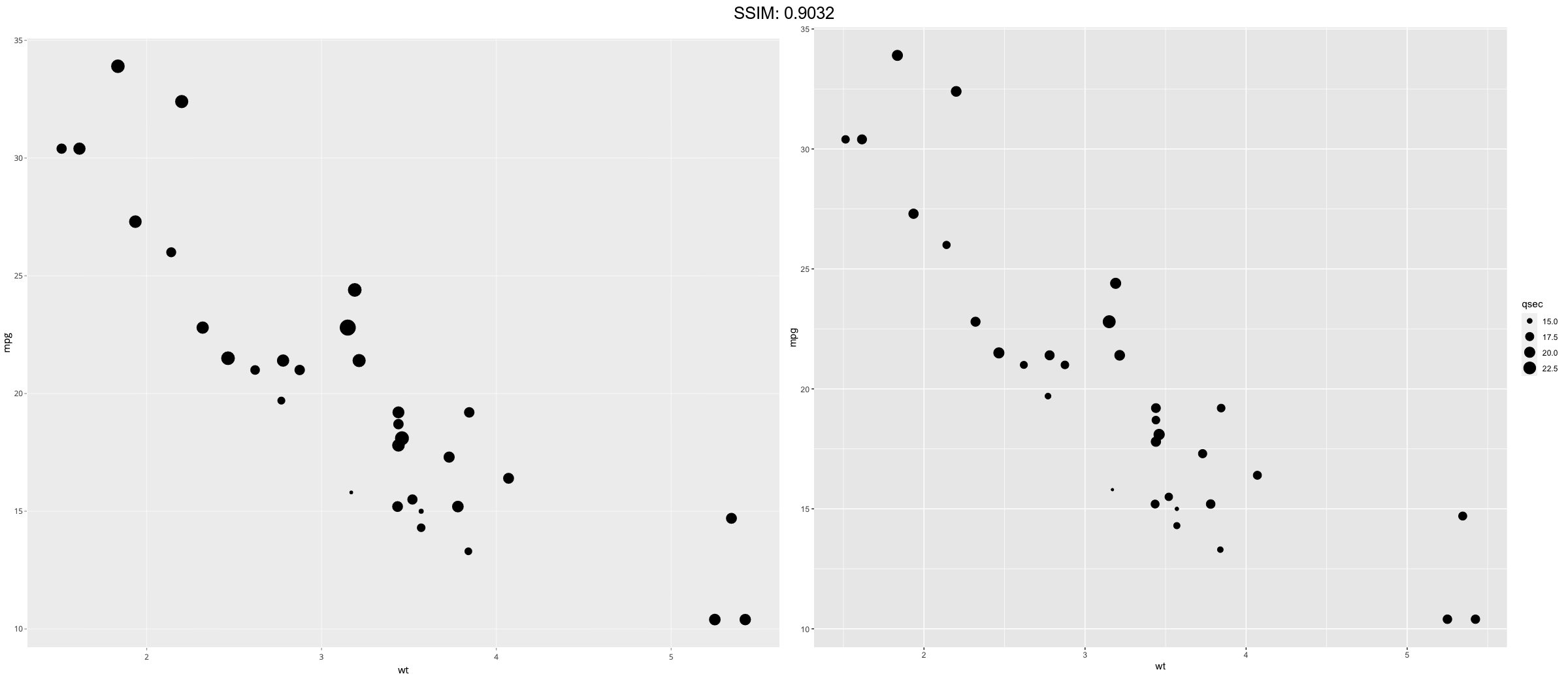p <- ggplot(mtcars, aes(wt, mpg)) p <- p + geom_point(aes(size = qsec))