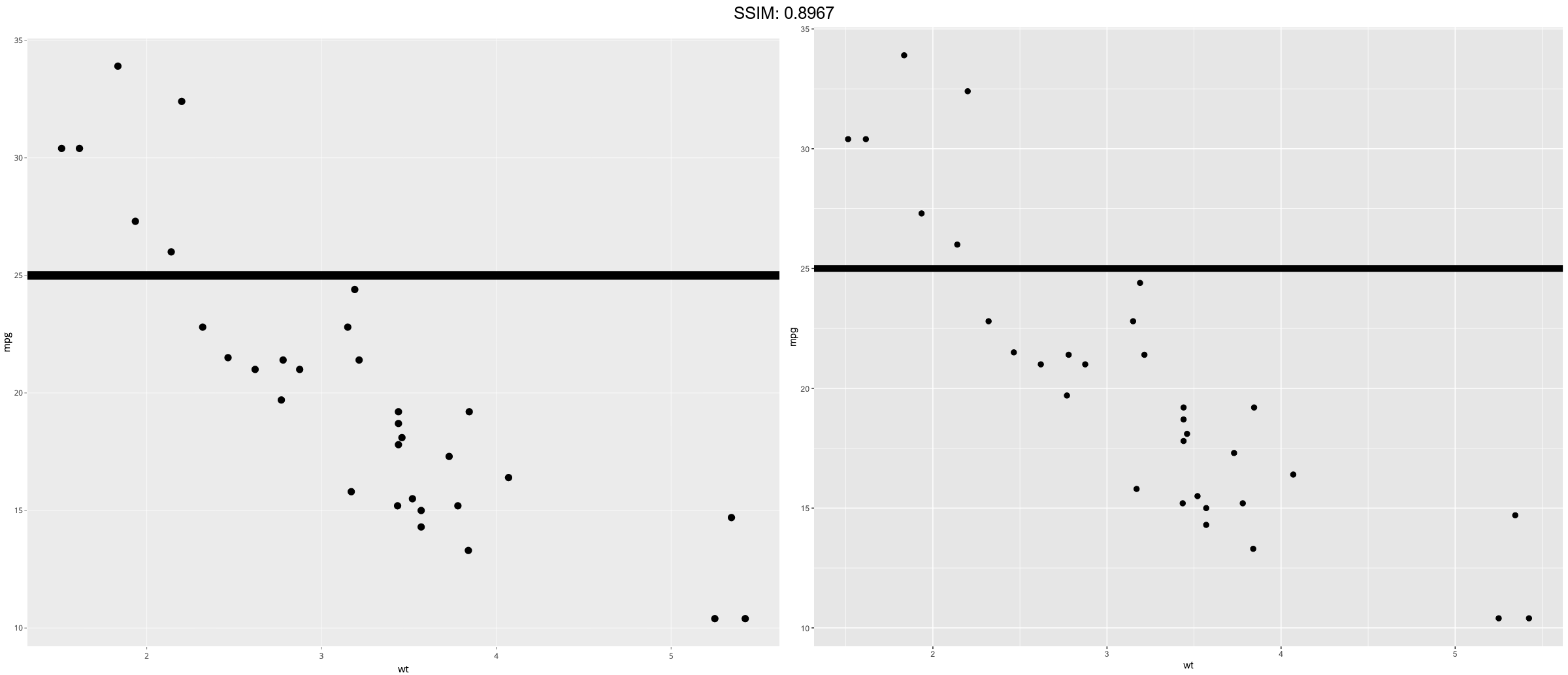 p <- ggplot(mtcars, aes(wt, mpg)) p <- p + geom_point(size = 2.5) + geom_hline(yintercept = 25, size = 3.5)