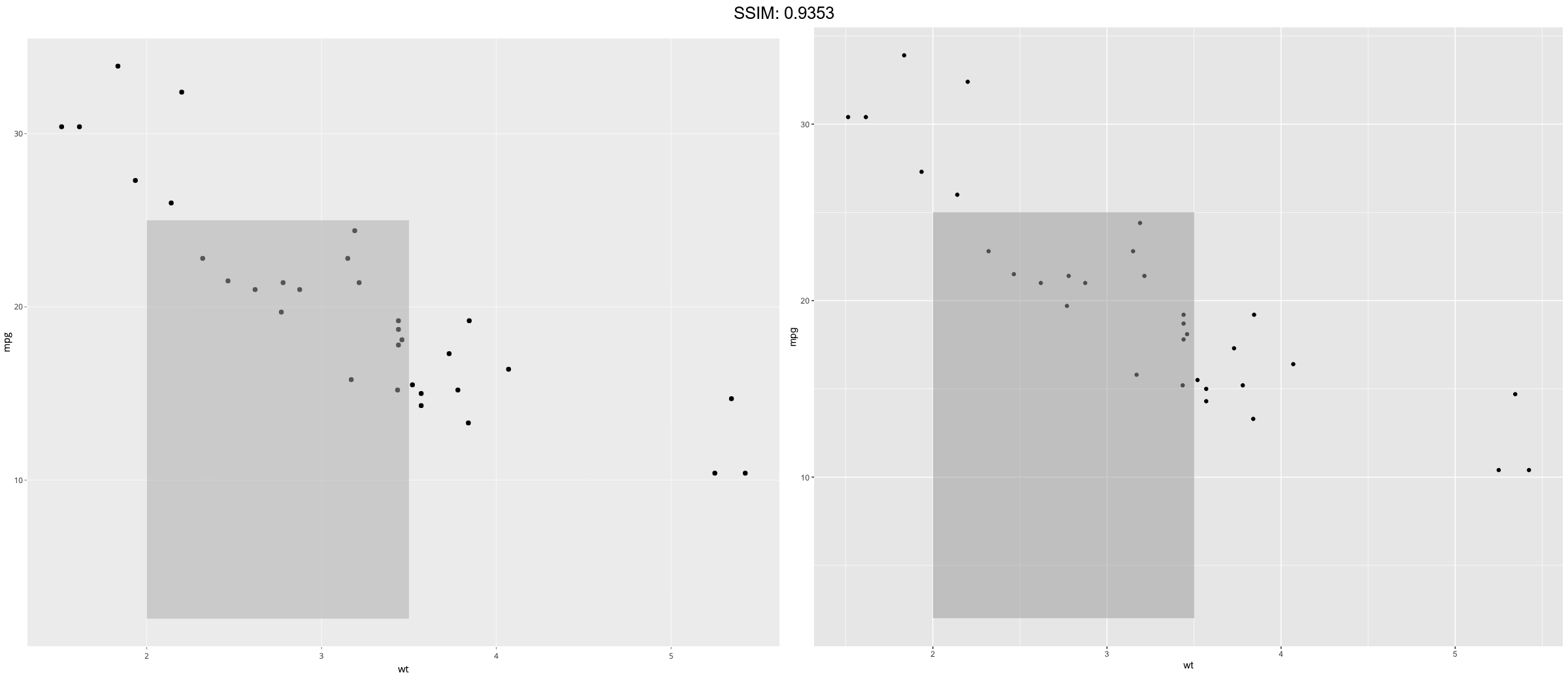 p <- ggplot(mtcars, aes(x = wt, y = mpg)) + geom_point() p <- p + annotate( "rect", xmin = 2, xmax = 3.5, ymin = 2, ymax = 25, fill = "dark grey", alpha = .5 )