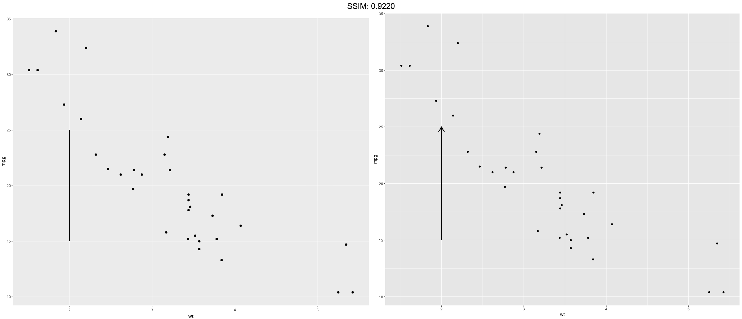 p <- ggplot(mtcars, aes(x = wt, y = mpg)) + geom_point() p <- p + geom_segment( aes(x = 2, y = 15, xend = 2, yend = 25), arrow = arrow(length = unit(0.5, "cm")) )