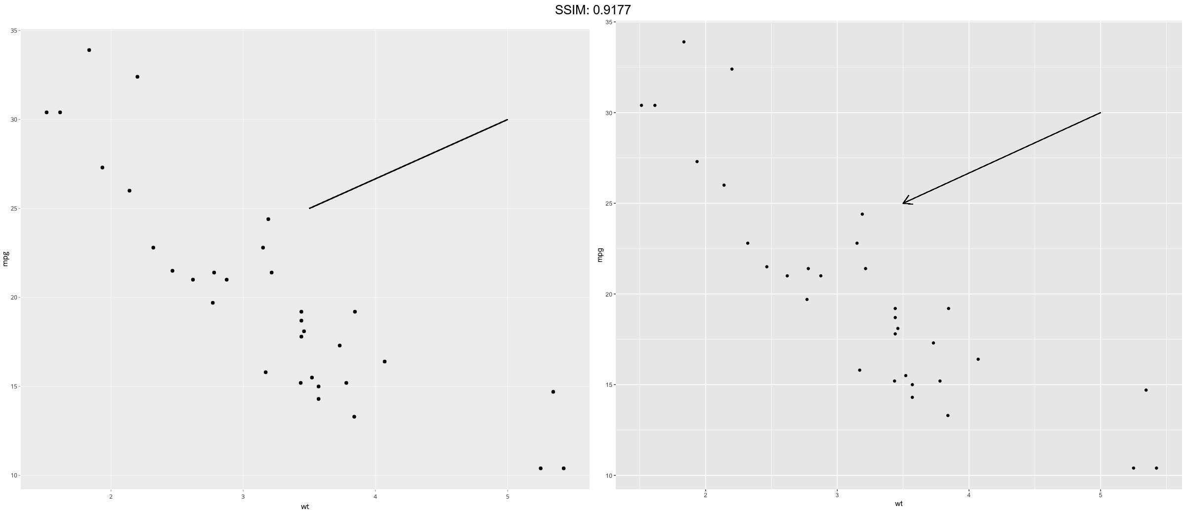 p <- ggplot(mtcars, aes(x = wt, y = mpg)) + geom_point() p <- p + geom_segment( aes(x = 2, y = 15, xend = 3, yend = 15), arrow = arrow(length = unit(0.5, "cm")) )