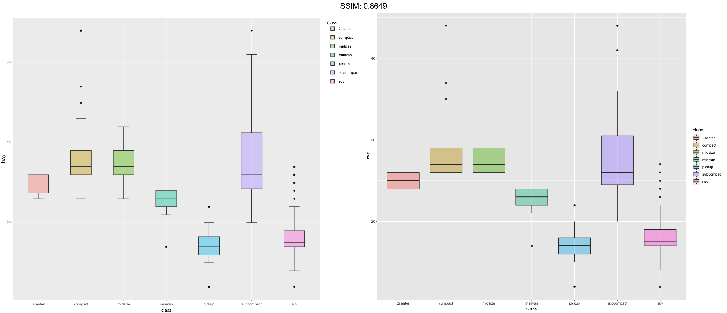 p <- ggplot(mpg, aes(class, hwy)) + geom_boxplot(aes(colour = class, fill = after_scale(alpha(colour, 0.4))))