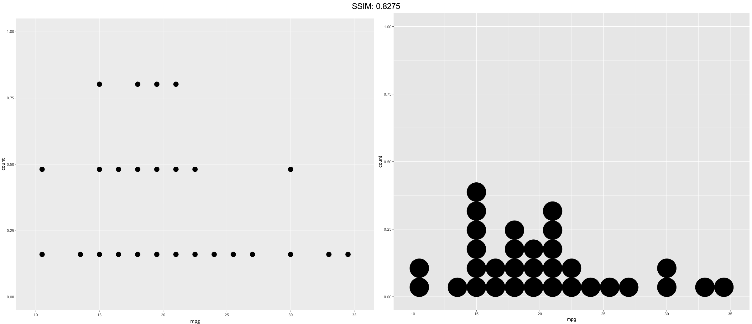 p <- ggplot(mtcars, aes(x = 1, y = mpg)) + geom_dotplot(binaxis = "y", stackdir = "center")