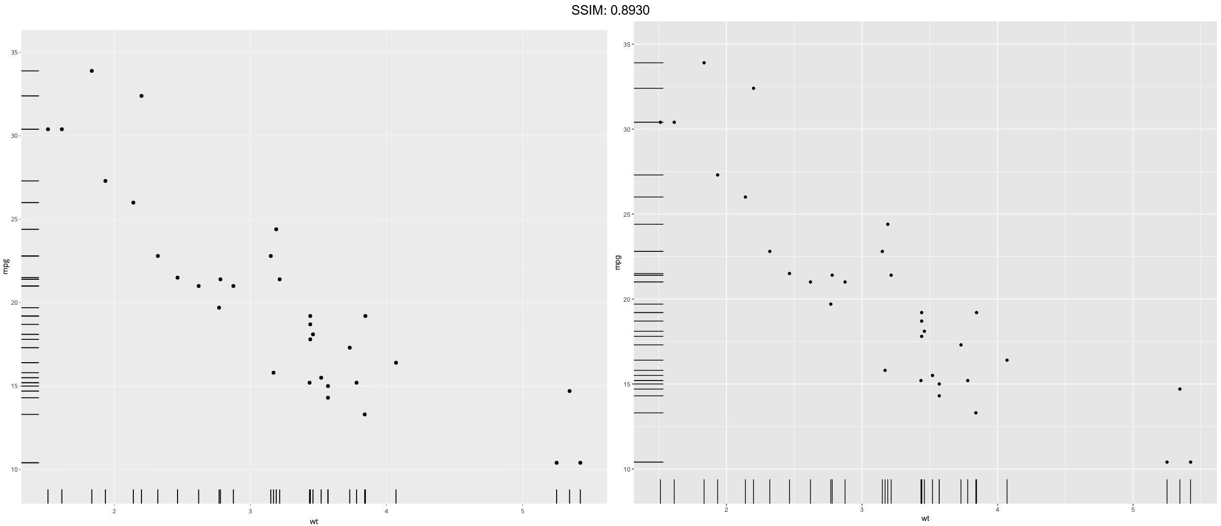 p <- ggplot(mtcars, aes(wt, mpg)) + geom_point() p <- p + geom_rug()