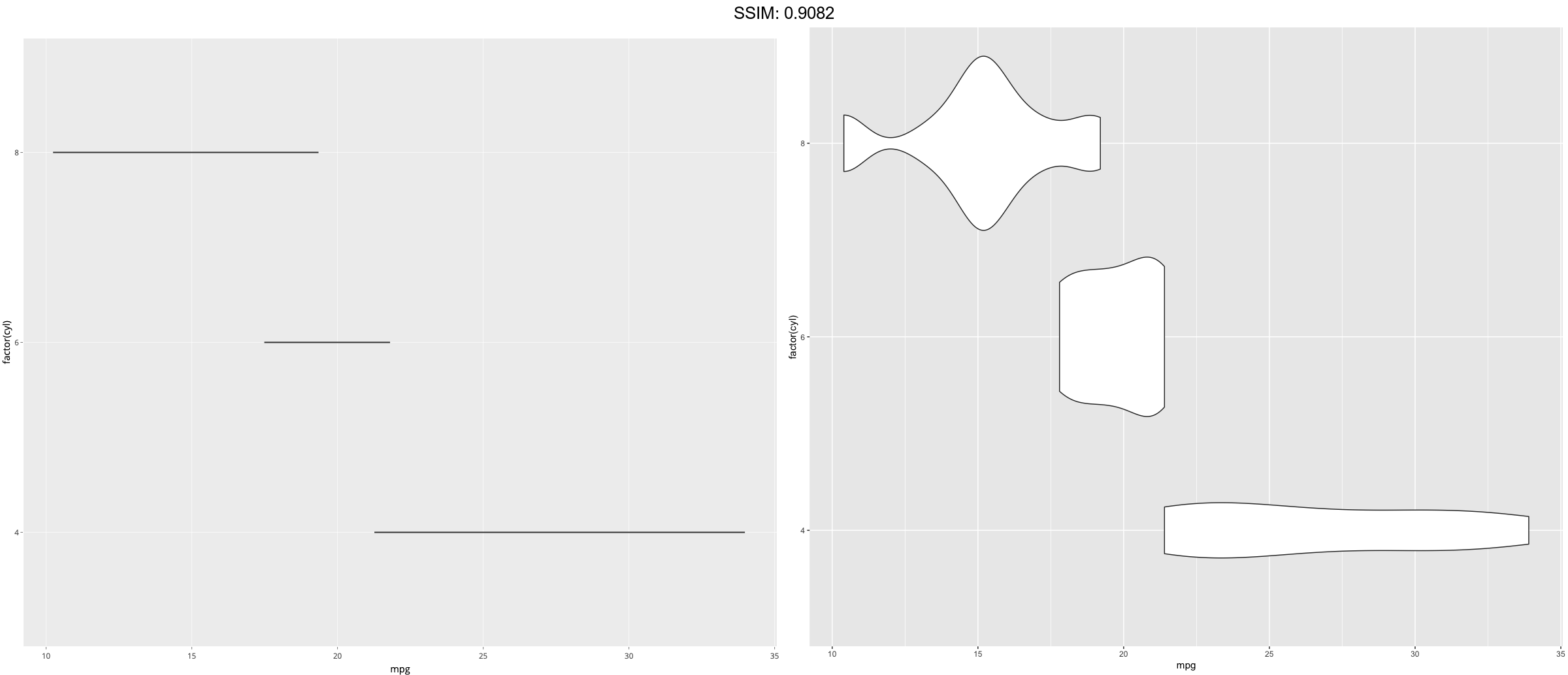 p <- ggplot(mtcars, aes(mpg, factor(cyl))) + geom_violin()