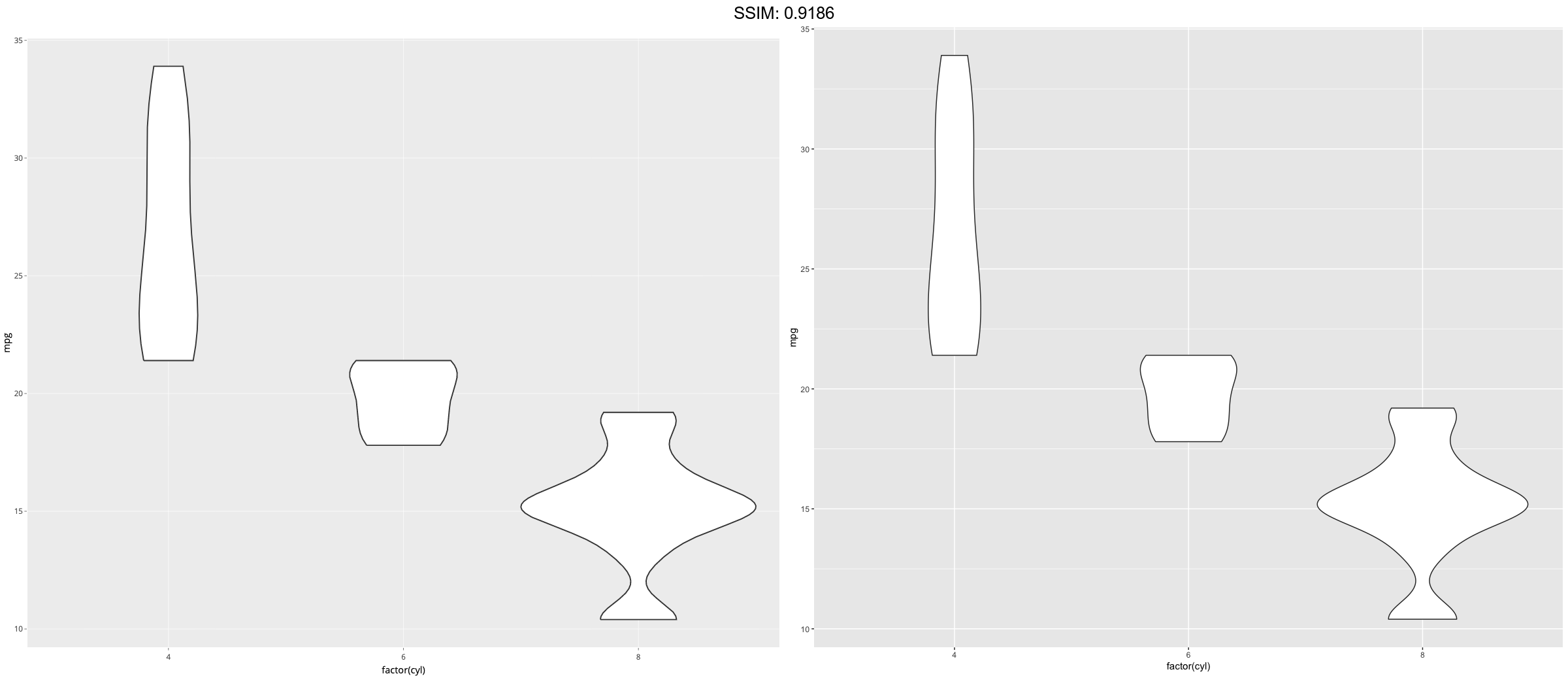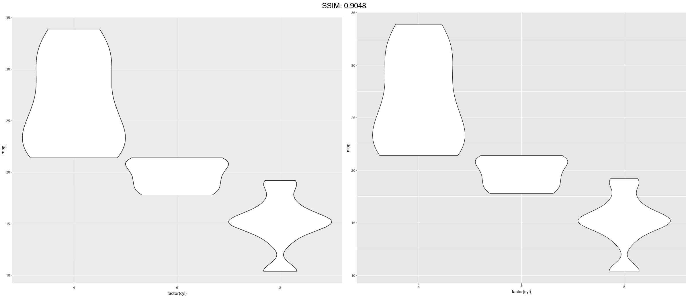 p <- ggplot(mtcars, aes(factor(cyl), mpg)) p <- p + geom_violin(trim = FALSE)