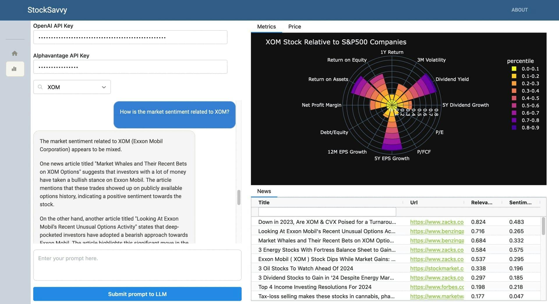 - A financial dashboard that shows information about stock market events, including earnings metrics from FinHub and news stories from AlphaVantage