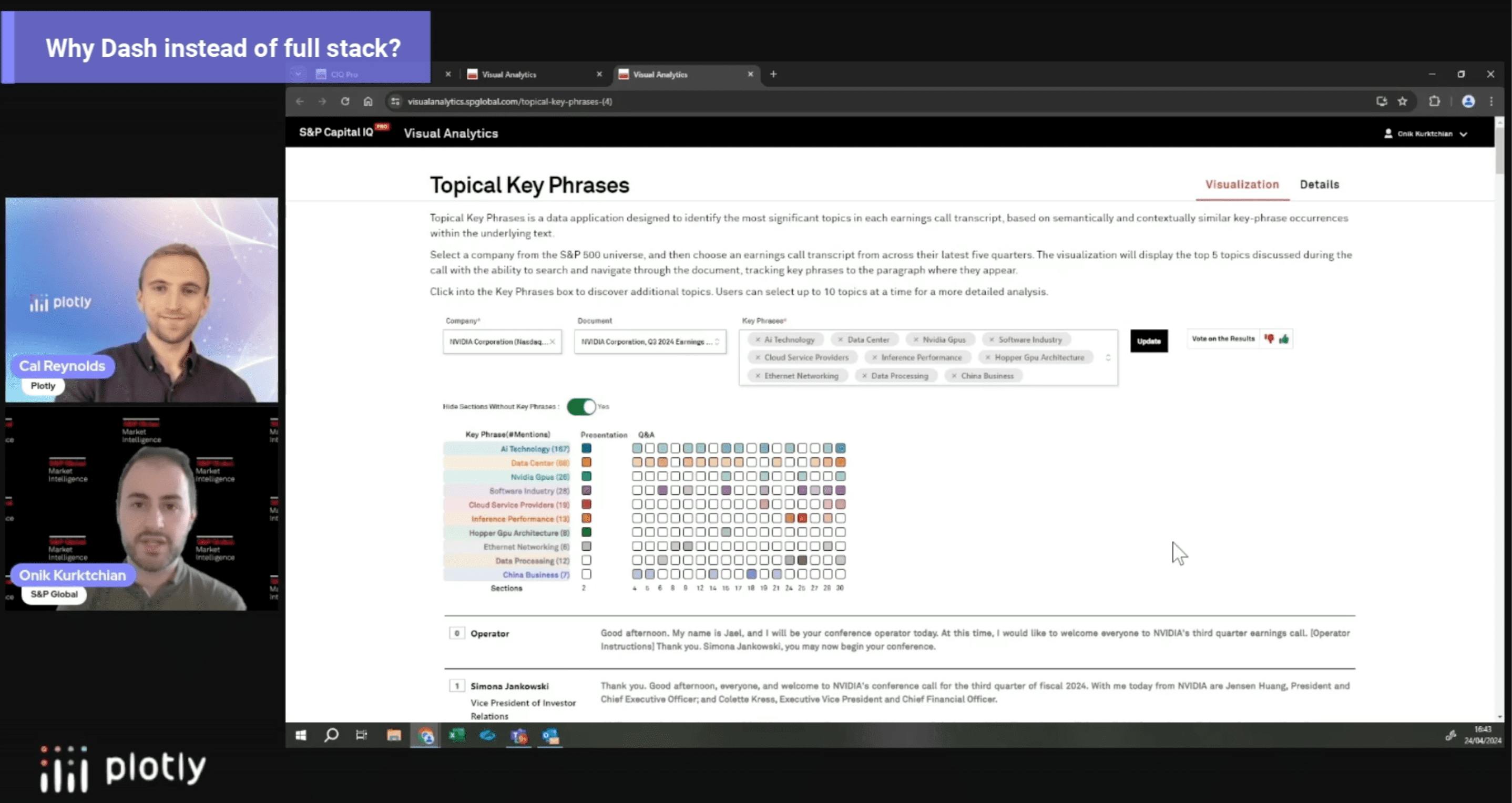To handle a large volume of unstructured data, S&P Global Market Intelligence needed a flexible, scalable solution. The team leveraged Dash Enterprise and Databricks to develop a series of custom production-grade applications that enabled their clients to easily find patterns, keywords, and insights from earnings call transcripts.